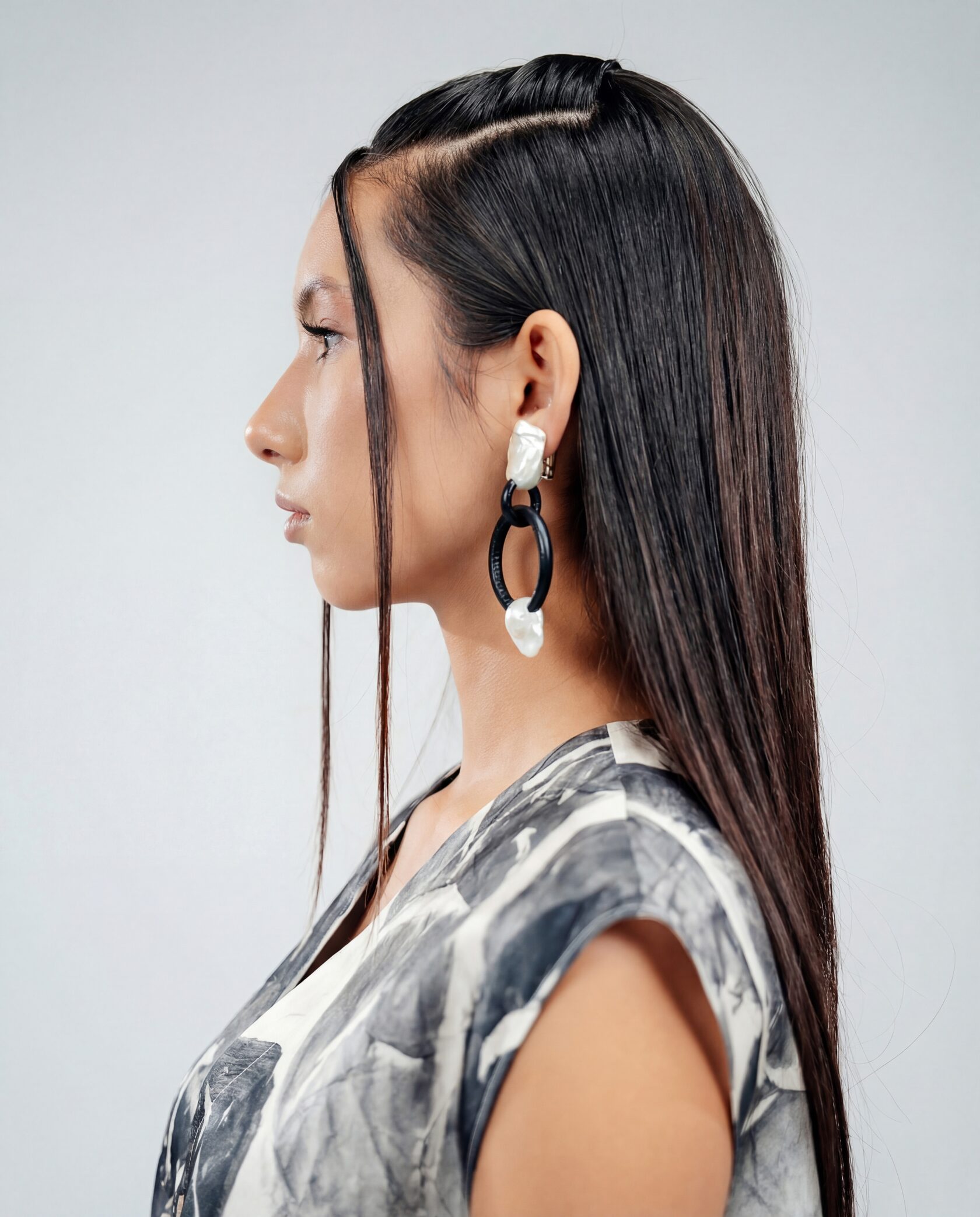 Қара сақиналар мен жарқыраған інжулерден тұратын контрастты клипстер.