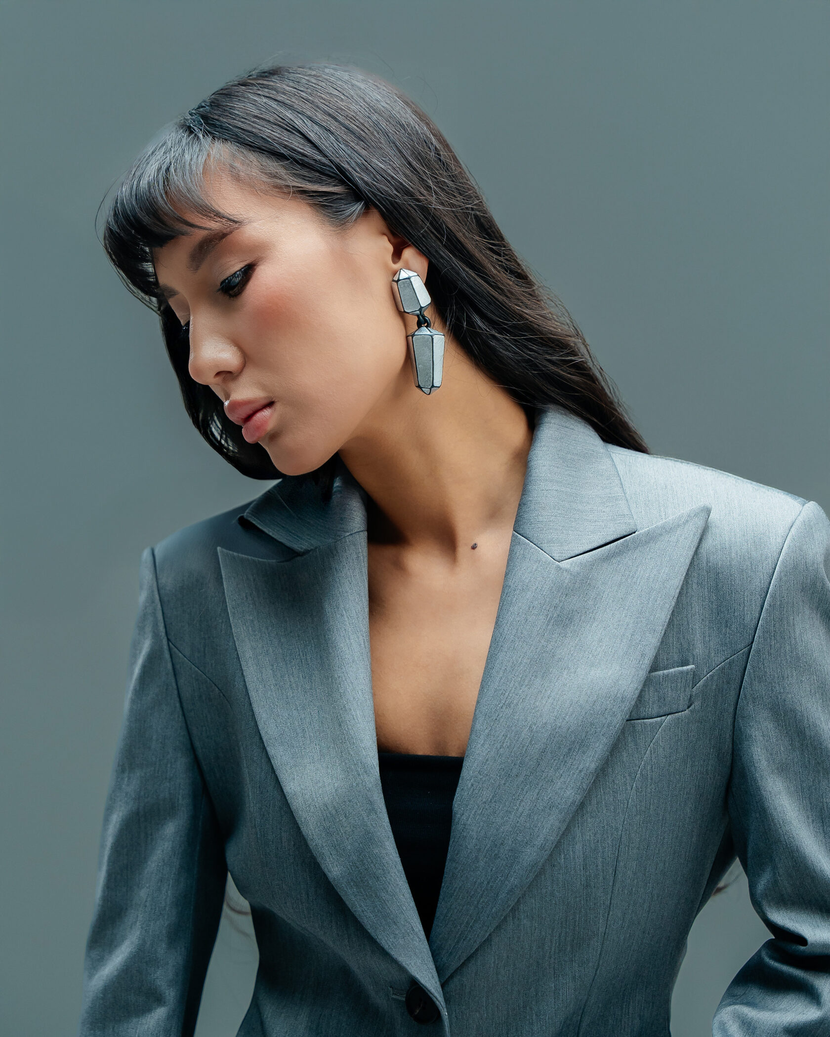 Геометричные клипсы, выполненные в серебристом тоне, напоминают миниатюрные скульптуры. Их поверхность словно огранена, что придаёт изделию архитектурный характер. Такие клипсы создают эффект «силы и строгости», идеально подойдут к минималистичному образу или строгому костюму. Несмотря на выразительность формы, они остаются лёгкими в носке и универсальными в сочетаниях — подойдут как для делового стиля, так и для смелого вечернего выхода.